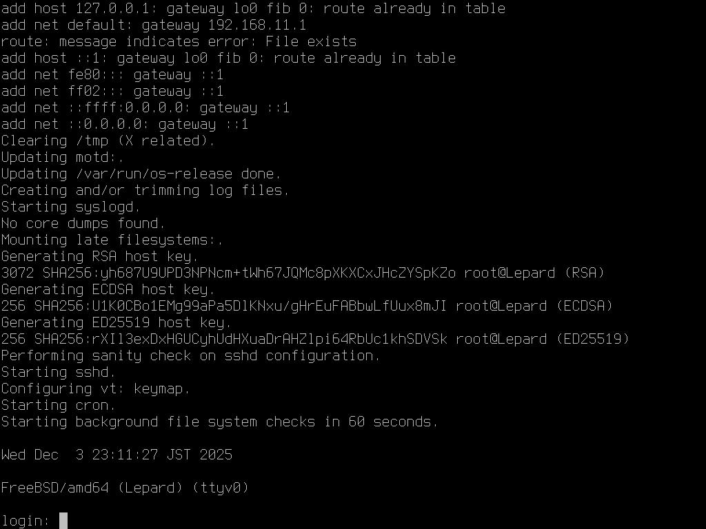 パッケージ (pkgbase / 新しい方法): ベースシステムは、「FreeBSD-base」リポジトリからパッケージセットとしてインストールされます。この方法でインストールされたシステムは、pkgツールを使用して完全に管理されます。この方法は、すべてのVMイメージとパブリッククラウドに公開されたイメージでデフォルトで使用されます。FreeBSD 15.0では、pkgbaseはテクノロジープレビューとして提供されていますが、将来のリリースではベースシステムのインストールとアップグレードを管理するための標準的な方法となる予定です。