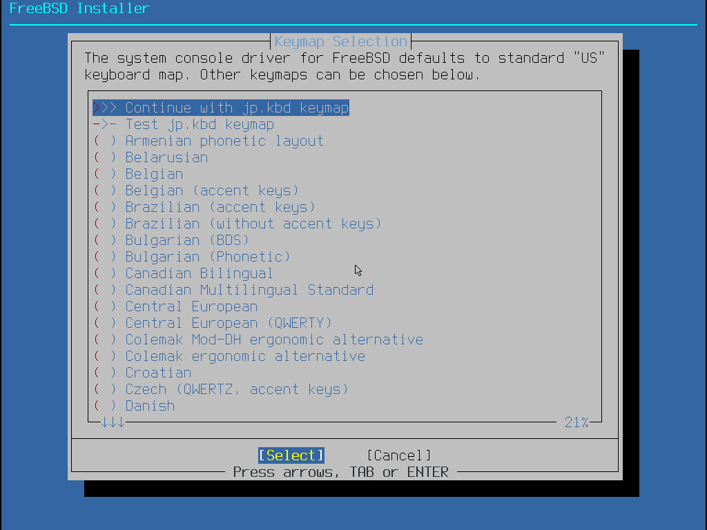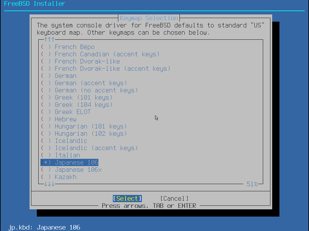 日本語キーボードなら「Japanese 106」をマークし、「Select」を選択しEnter
