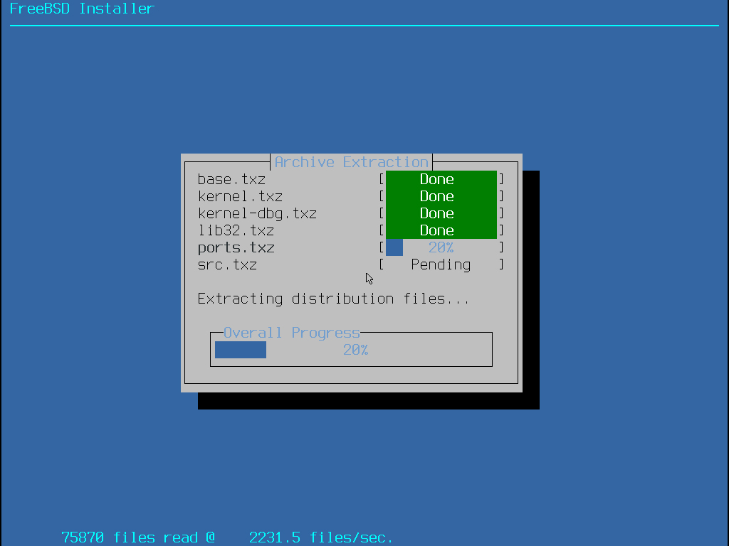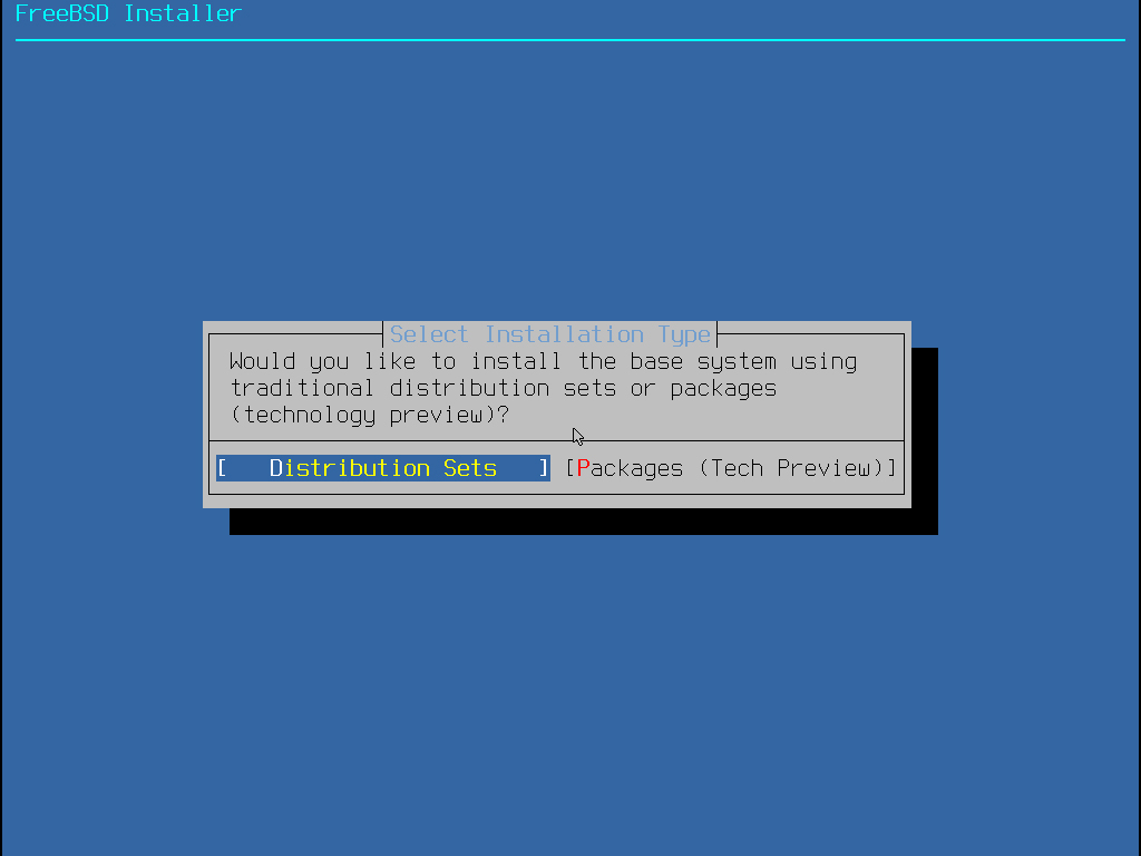 ディストリビューションセット(従来の方法):これは以前のFreeBSDリリースで使用されていた方法です。この方法でインストールされたシステムは、引き続きfreebsd-updateユーティリティを使用してアップデートを行います。ディストリビューションセットのサポートはFreeBSD 16で削除される予定ですが、FreeBSD 15安定ブランチの存続期間中は(freebsd-updateのサポートと共に)継続されます。