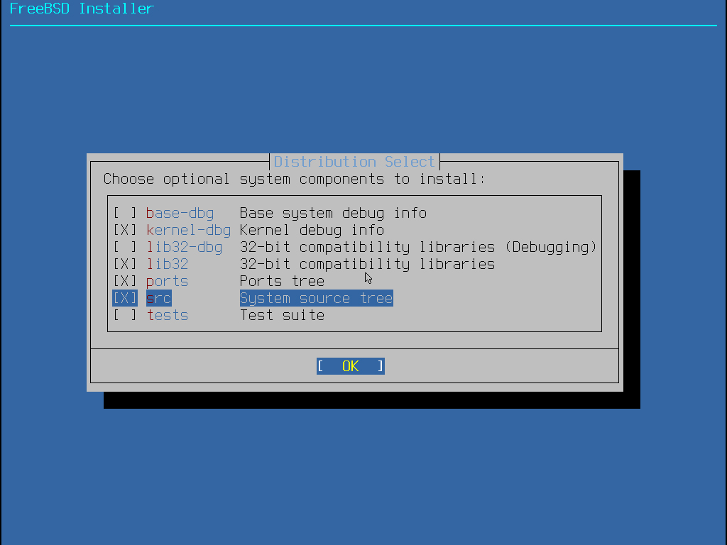 10.ディストリビューションの選択--下記のように「ports」「src」にマークし、OKを選択しEnter