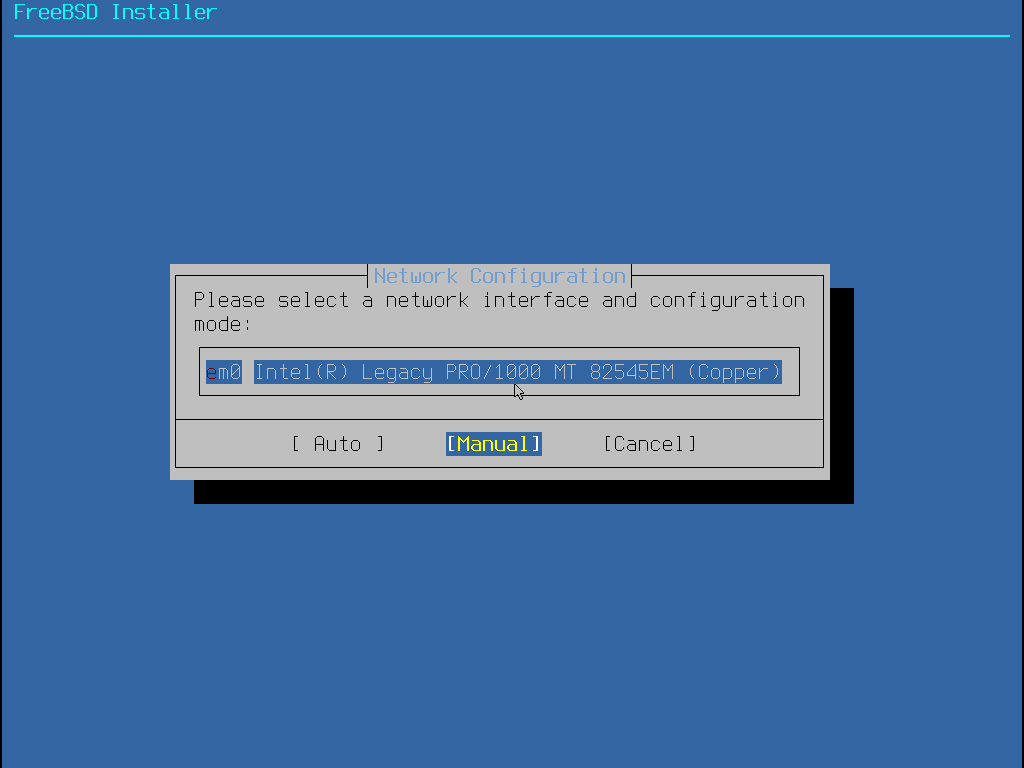 使用するネットワークインターフェース名を確認し、ネットワーク設定を手動で行うので[Manual]を選択しEnter