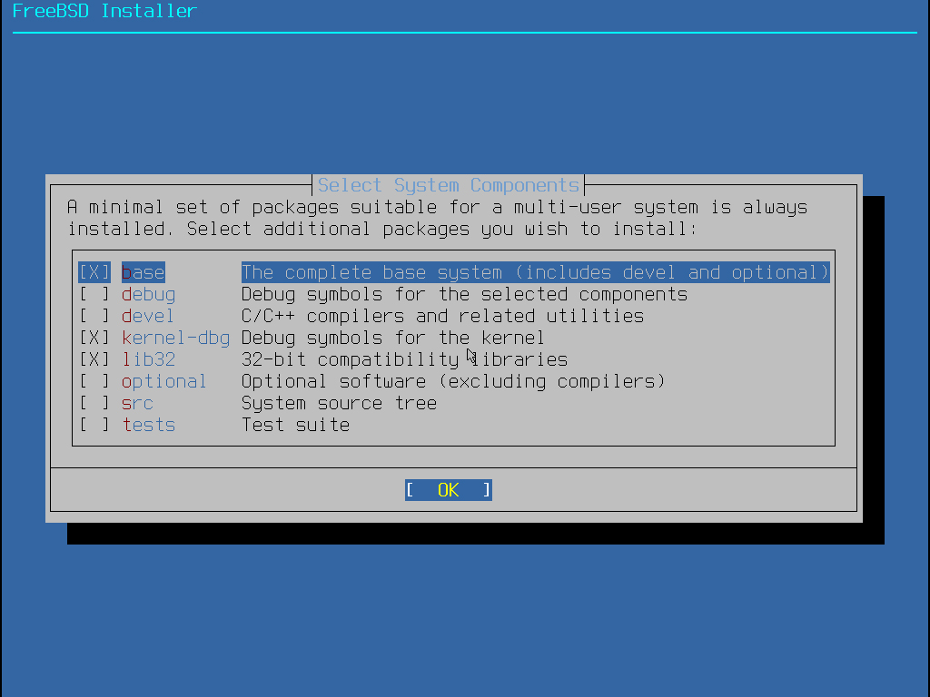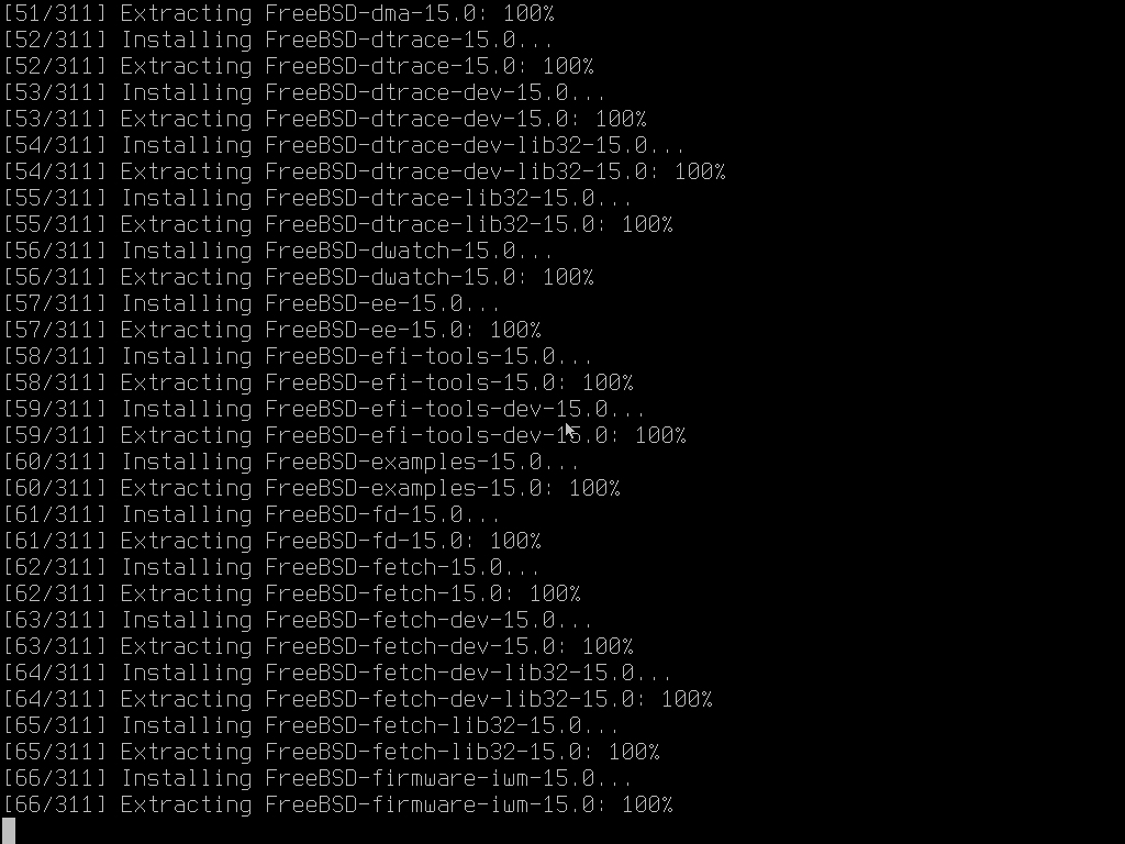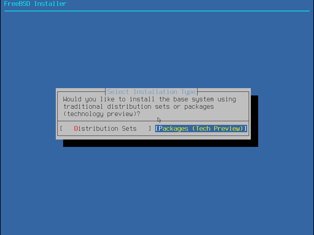 パッケージ (pkgbase / 新しい方法): ベースシステムは、「FreeBSD-base」リポジトリからパッケージセットとしてインストールされます。この方法でインストールされたシステムは、pkgツールを使用して完全に管理されます。この方法は、すべてのVMイメージとパブリッククラウドに公開されたイメージでデフォルトで使用されます。FreeBSD 15.0では、pkgbaseはテクノロジープレビューとして提供されていますが、将来のリリースではベースシステムのインストールとアップグレードを管理するための標準的な方法となる予定です。