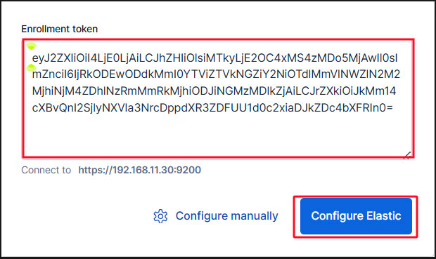 /usr/share/elasticsearch/bin/elasticsearch-create-enrollment-token -s kibana, コマンドを使用して生成された Kibana トークンをコピーし、ボックスに貼り付ける