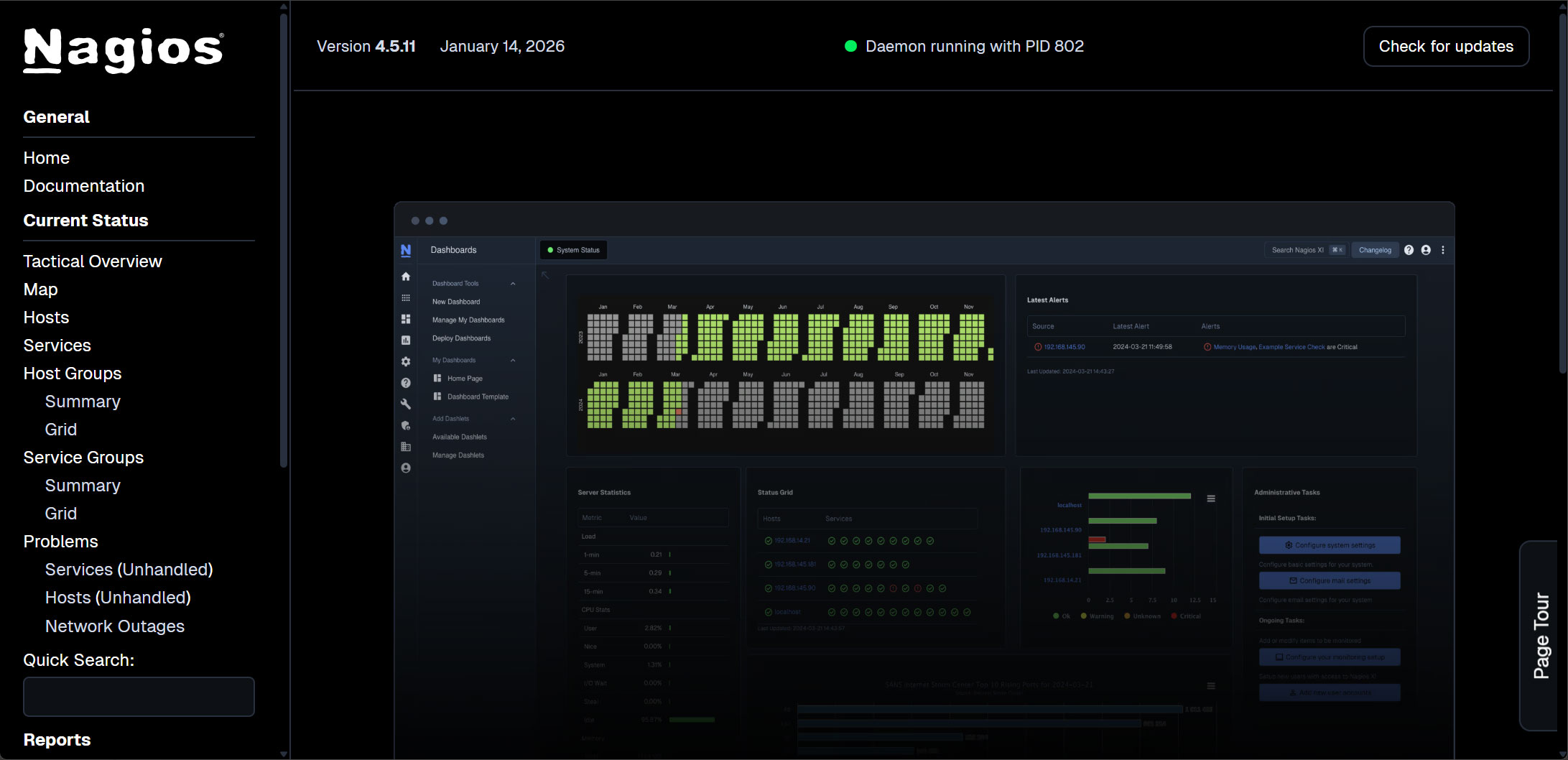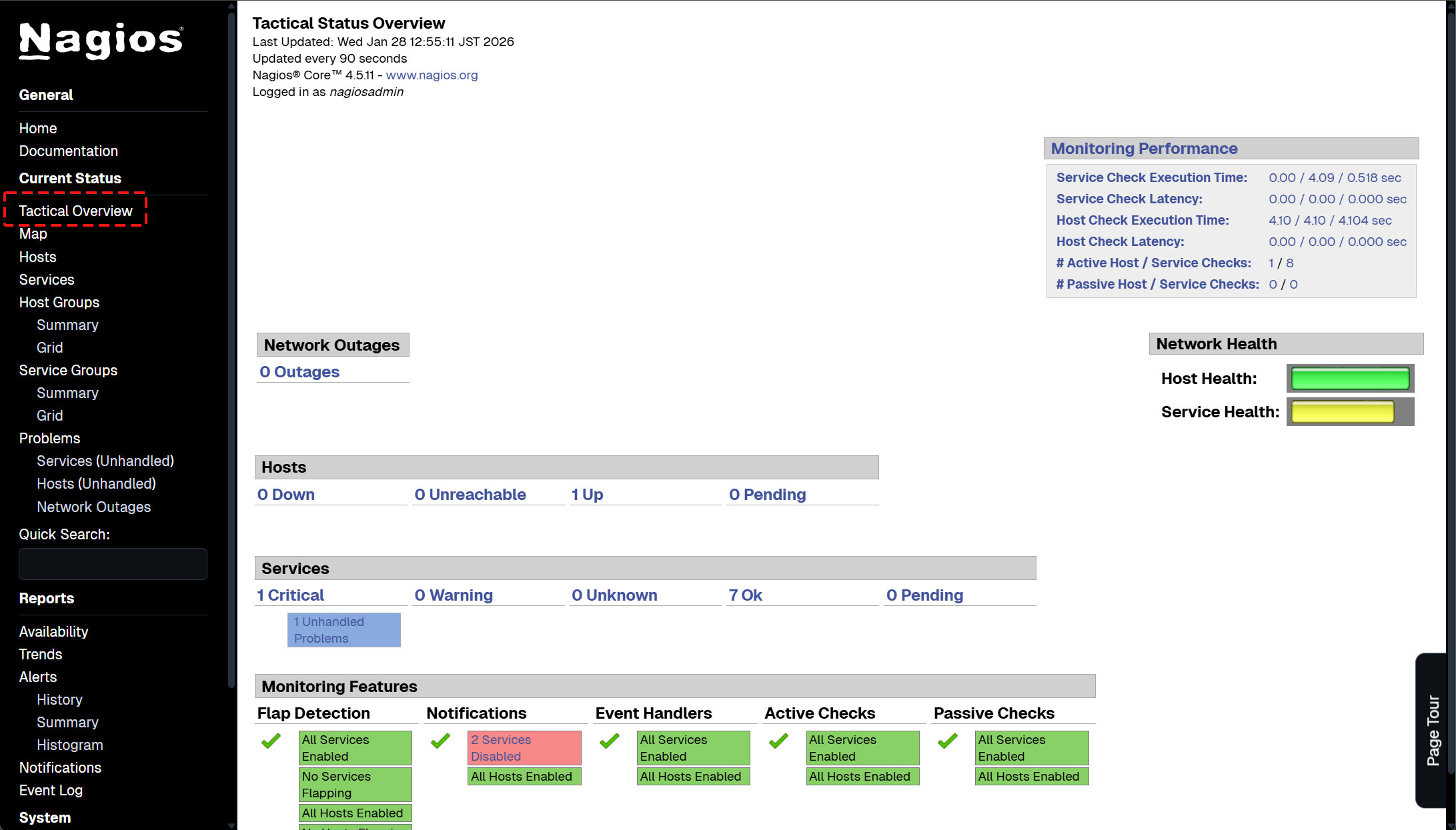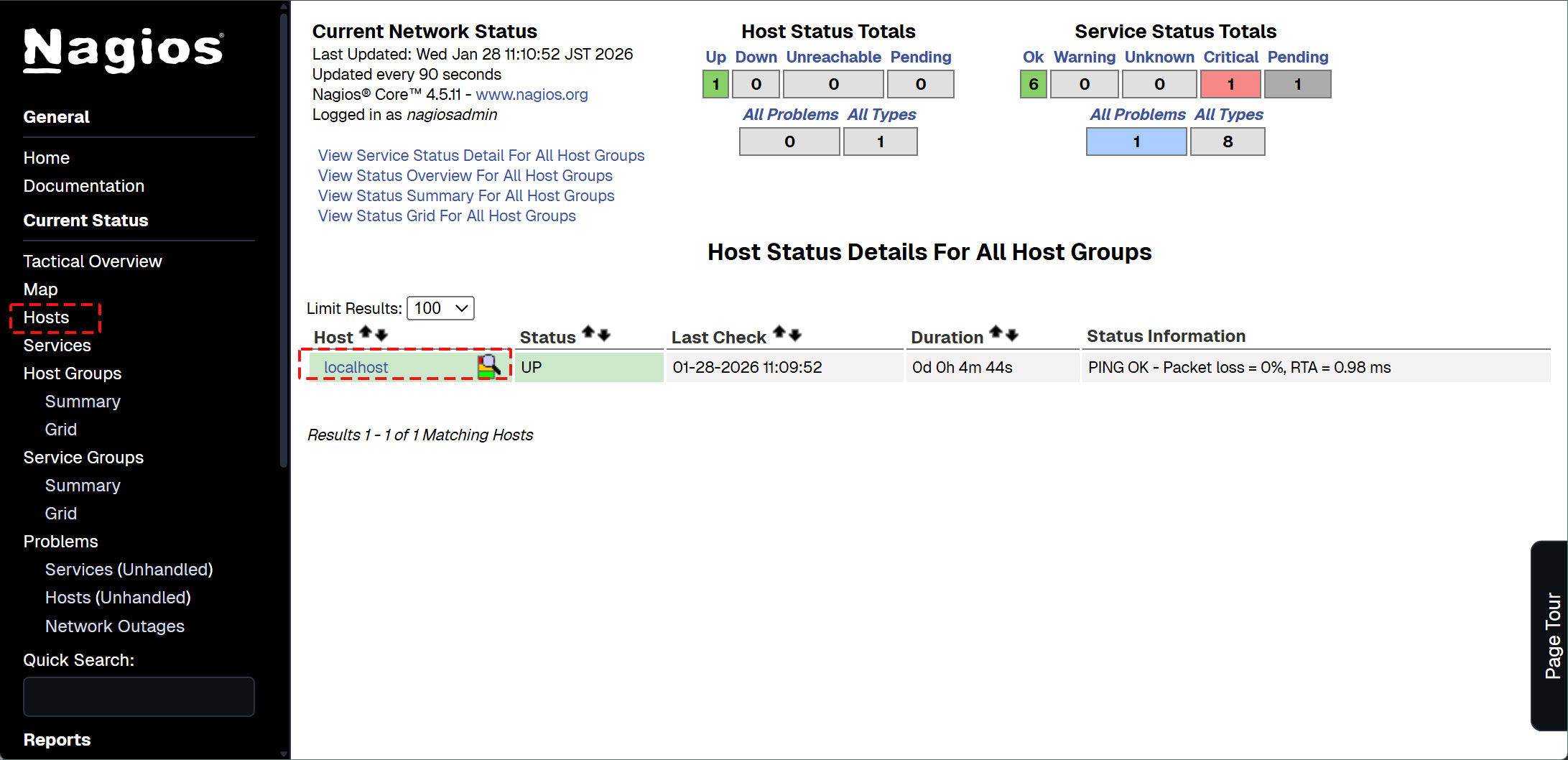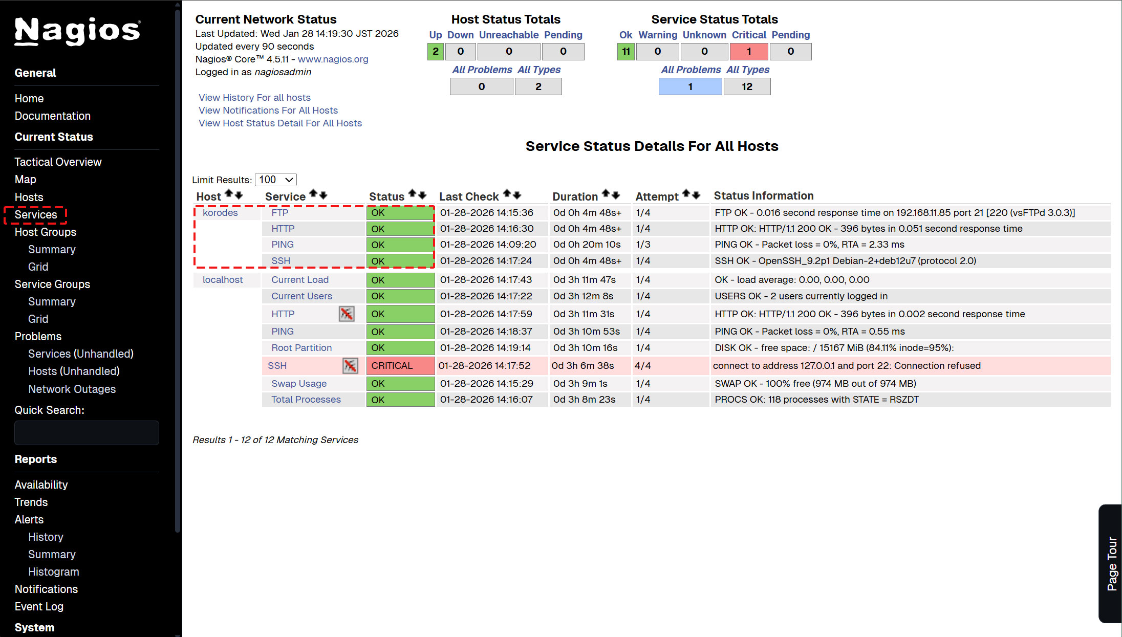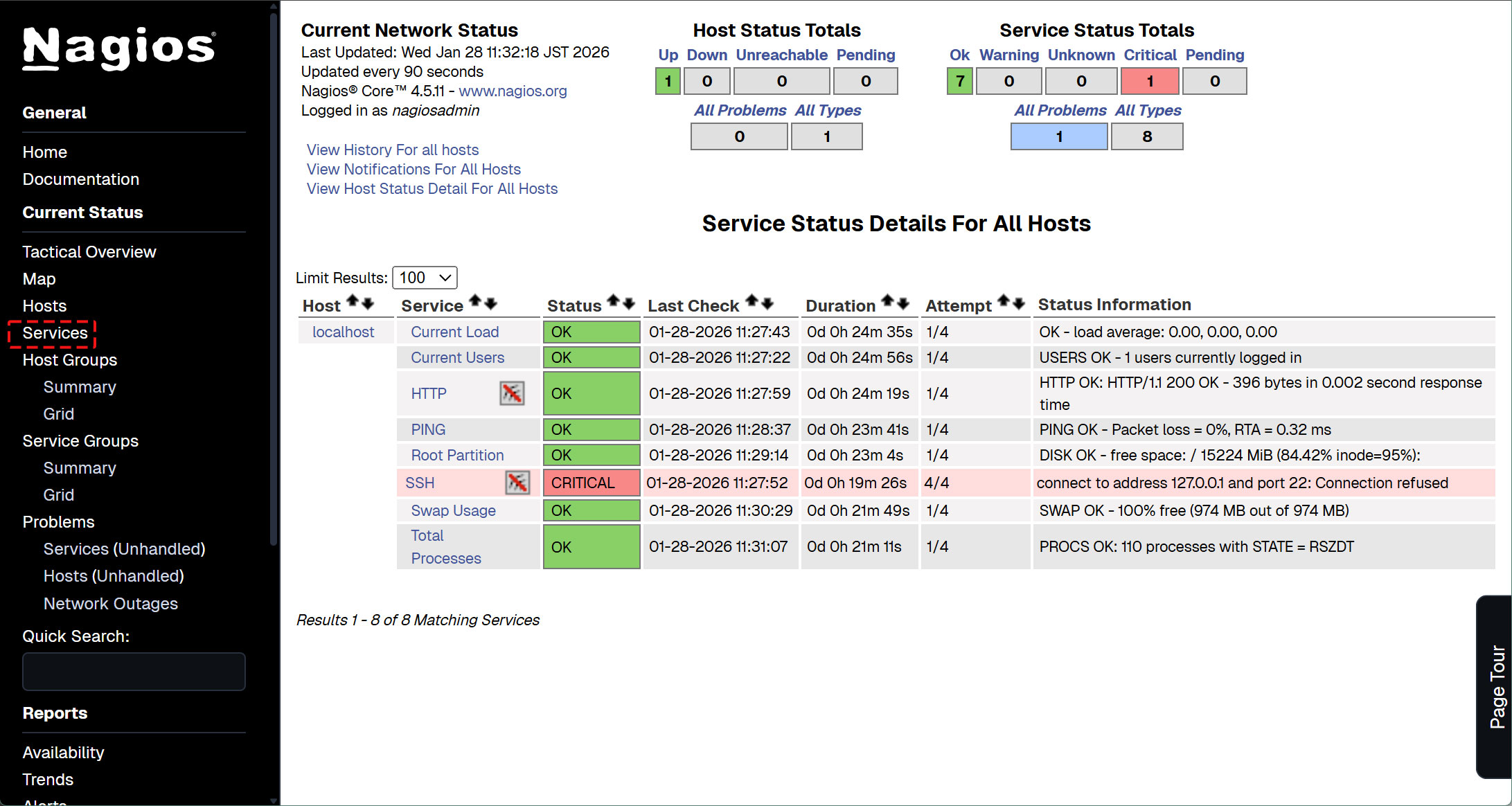 # systemctl status nagios ● nagios.service - Nagios Core 4.5.11 Loaded: loaded (/lib/systemd/system/nagios.service; enabled; preset: enabled) Active: active (running) since Wed 2026-01-28 11:07:06 JST; 27s ago Docs: https://www.nagios.org/documentation Process: 769 ExecStartPre=/usr/local/nagios/bin/nagios -v /usr/local/nagios/etc/nagios.cfg (code=exited, status=0/SUCCESS) Process: 792 ExecStart=/usr/local/nagios/bin/nagios -d /usr/local/nagios/etc/nagios.cfg (code=exited, status=0/SUCCESS) Main PID: 802 (nagios) Tasks: 6 (limit: 2256) Memory: 9.6M CPU: 52ms CGroup: /system.slice/nagios.service ├─802 /usr/local/nagios/bin/nagios -d /usr/local/nagios/etc/nagios.cfg ├─807 /usr/local/nagios/bin/nagios --worker /usr/local/nagios/var/rw/nagios.qh ├─808 /usr/local/nagios/bin/nagios --worker /usr/local/nagios/var/rw/nagios.qh ├─809 /usr/local/nagios/bin/nagios --worker /usr/local/nagios/var/rw/nagios.qh ├─810 /usr/local/nagios/bin/nagios --worker /usr/local/nagios/var/rw/nagios.qh └─811 /usr/local/nagios/bin/nagios -d /usr/local/nagios/etc/nagios.cfg Jan 28 11:07:06 Lepard nagios[802]: qh: Socket '/usr/local/nagios/var/rw/nagios.qh' successfully initialized Jan 28 11:07:06 Lepard nagios[802]: qh: core query handler registered Jan 28 11:07:06 Lepard nagios[802]: qh: echo service query handler registered Jan 28 11:07:06 Lepard nagios[802]: qh: help for the query handler registered Jan 28 11:07:06 Lepard nagios[802]: wproc: Successfully registered manager as @wproc with query handler Jan 28 11:07:06 Lepard nagios[802]: wproc: Registry request: name=Core Worker 809;pid=809 Jan 28 11:07:06 Lepard nagios[802]: wproc: Registry request: name=Core Worker 807;pid=807 Jan 28 11:07:06 Lepard nagios[802]: wproc: Registry request: name=Core Worker 808;pid=808 Jan 28 11:07:06 Lepard nagios[802]: wproc: Registry request: name=Core Worker 810;pid=810 Jan 28 11:07:06 Lepard nagios[802]: Successfully launched command file worker with pid 811 |