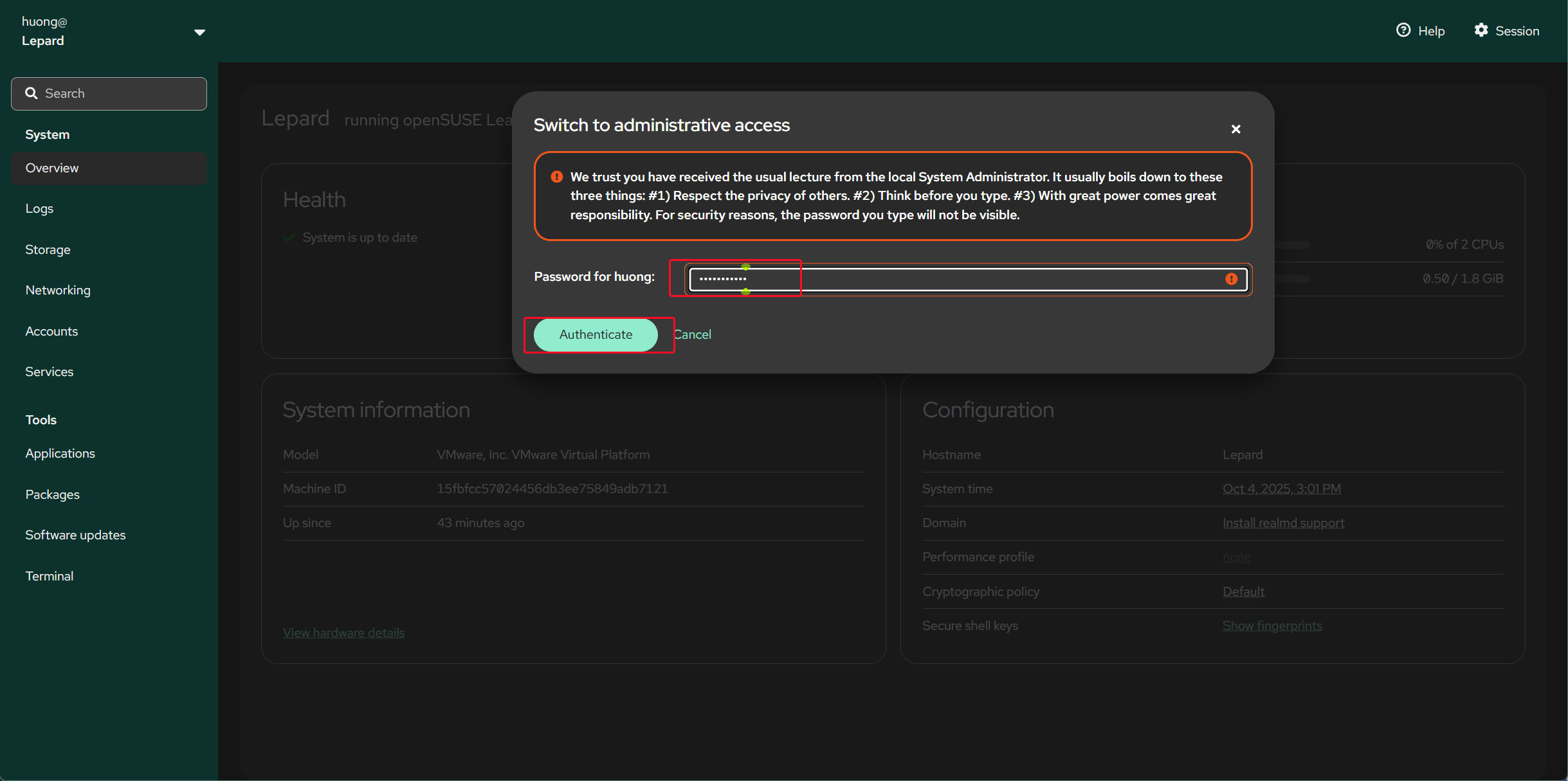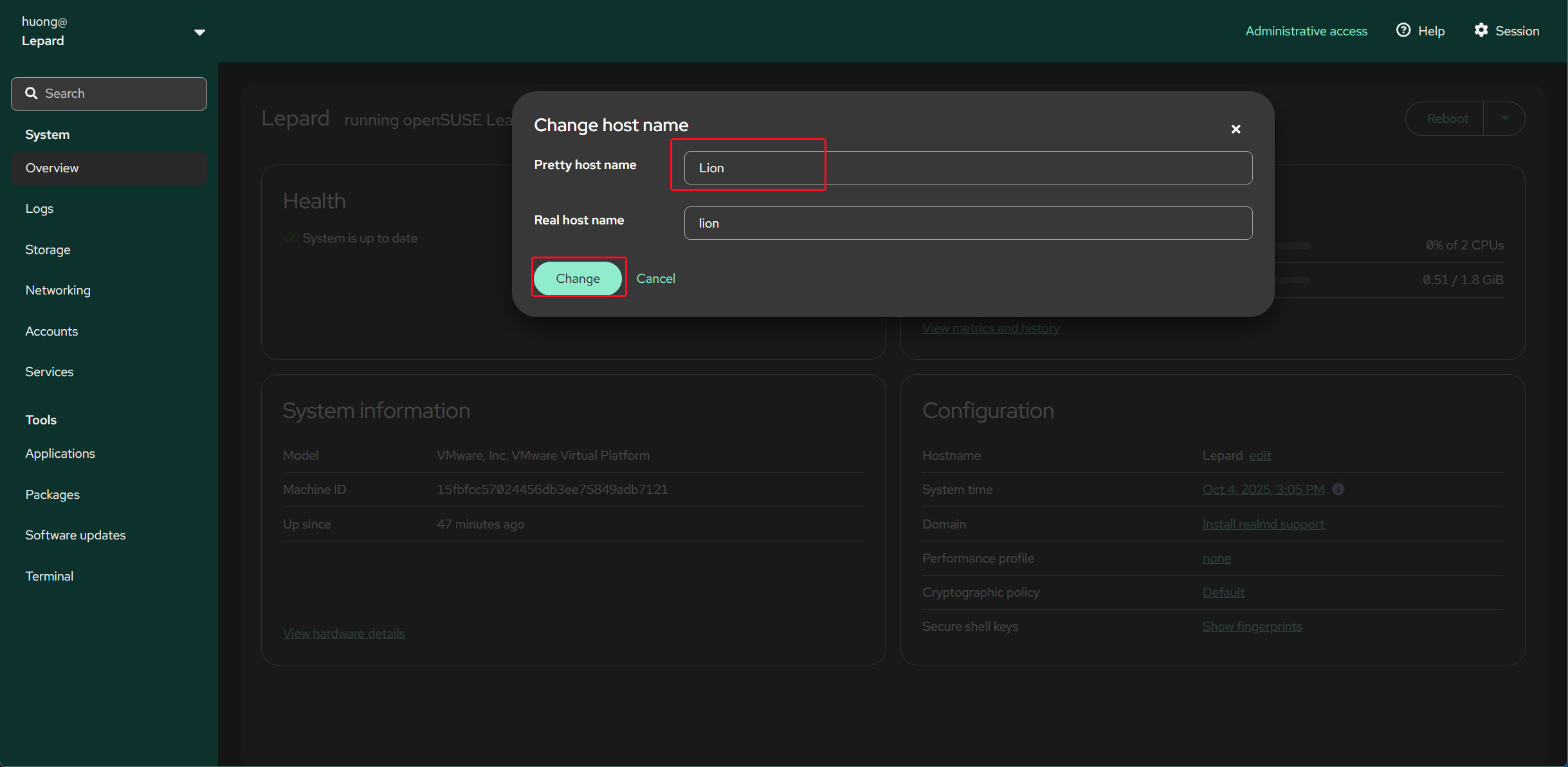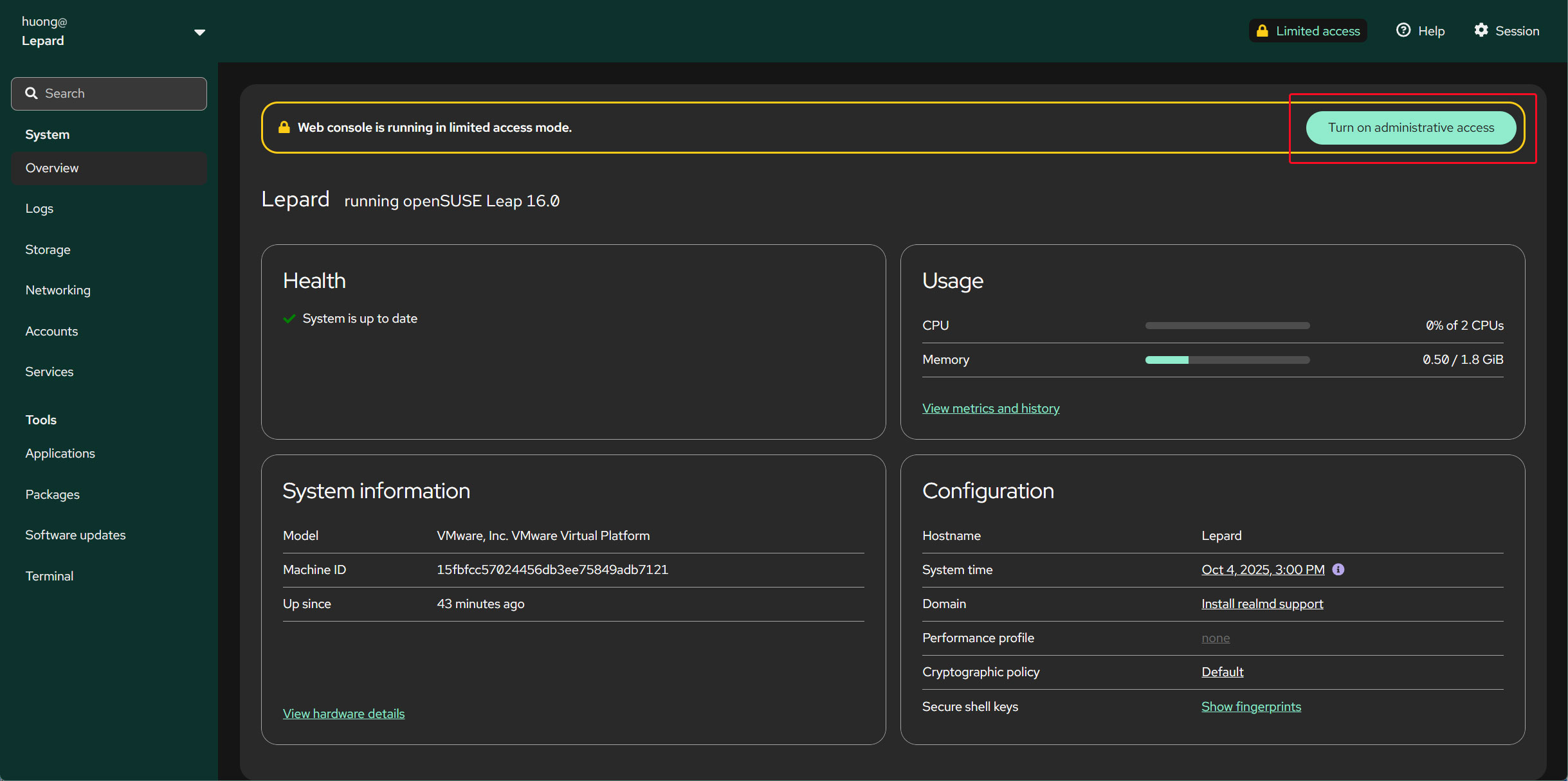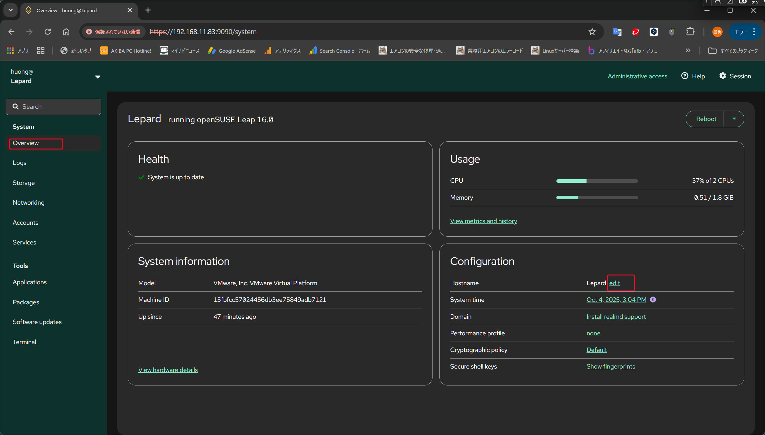 # systemctl enable --now cockpit.socket # systemctl status cockpit.socket ● cockpit.socket - Cockpit Web Service Socket Loaded: loaded (/usr/lib/systemd/system/cockpit.socket; enabled; preset: enabled) Active: active (listening) since Sat 2025-10-04 15:20:53 JST; 5min ago Invocation: 688c8badb1fe4a18a0bebacfea8fb6a8 Triggers: ● cockpit.service Docs: man:cockpit-ws(8) Listen: [::]:9090 (Stream) Process: 759 ExecStartPre=/usr/libexec/check_cockpit_users (code=exited, status=0/SUCCESS) Process: 784 ExecStartPost=/usr/share/cockpit/issue/update-issue localhost (code=exited, status=0/SUCCESS) Process: 809 ExecStartPost=/bin/ln -snf active.issue /run/cockpit/issue (code=exited, status=0/SUCCESS) Tasks: 0 (limit: 2228) CPU: 41ms CGroup: /system.slice/cockpit.socket Oct 04 15:20:53 lepard systemd[1]: Starting Cockpit Web Service Socket... Oct 04 15:20:53 lepard systemd[1]: Listening on Cockpit Web Service Socket. |