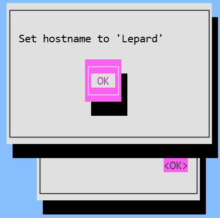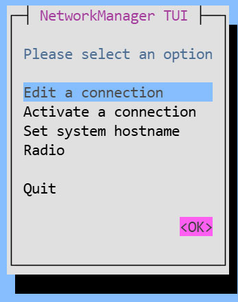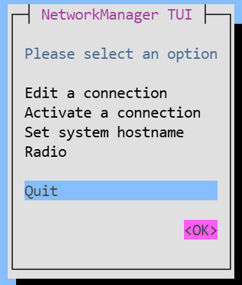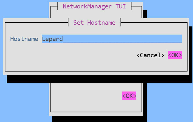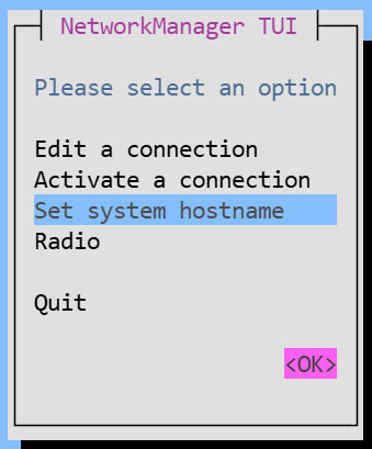[NetworkManager TUI]の最初の画面に戻り[Set system hostname]を選択し、<OK>をクリック