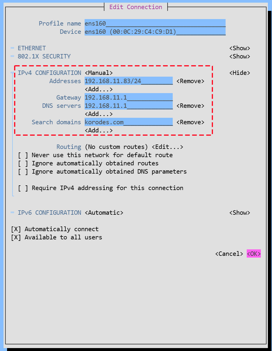 # 固定 IPv4 アドレス設定 # nmcli connection modify ens160 ipv4.addresses 192.168.11.83/24 # ゲートウェイ設定 # nmcli connection modify ens160 ipv4.gateway 192.168.11.1 # 参照する DNS 設定 # nmcli connection modify ens160 ipv4.dns 192.168.11.1 # DNS サーチベース 設定 (自身のドメイン名) # nmcli connection modify ens160 ipv4.dns-search [Domain] # IP アドレス固定割り当てに設定 # nmcli connection modify ens160 ipv4.method manual # インターフェースを再起動して設定を反映 # nmcli connection down ens160; nmcli connection up ens160 |