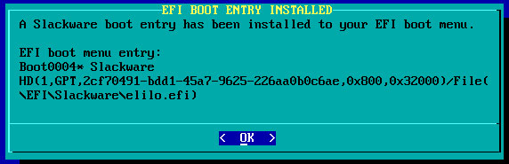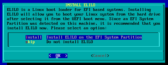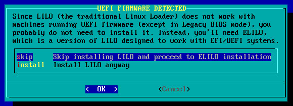 UEFIファームウェアで稼働しているPCでは、LILOが動かないため、EFI/UEFIシステム用にデザインされたELILOのインストールに進みます