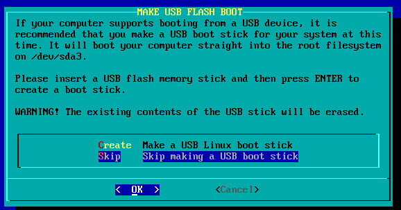 緊急用のBootstickを作成する場合は、USBメモリを差し込み、Createを選択して、Enterキーを押します。今回は作成しませんので[Skip]を選択