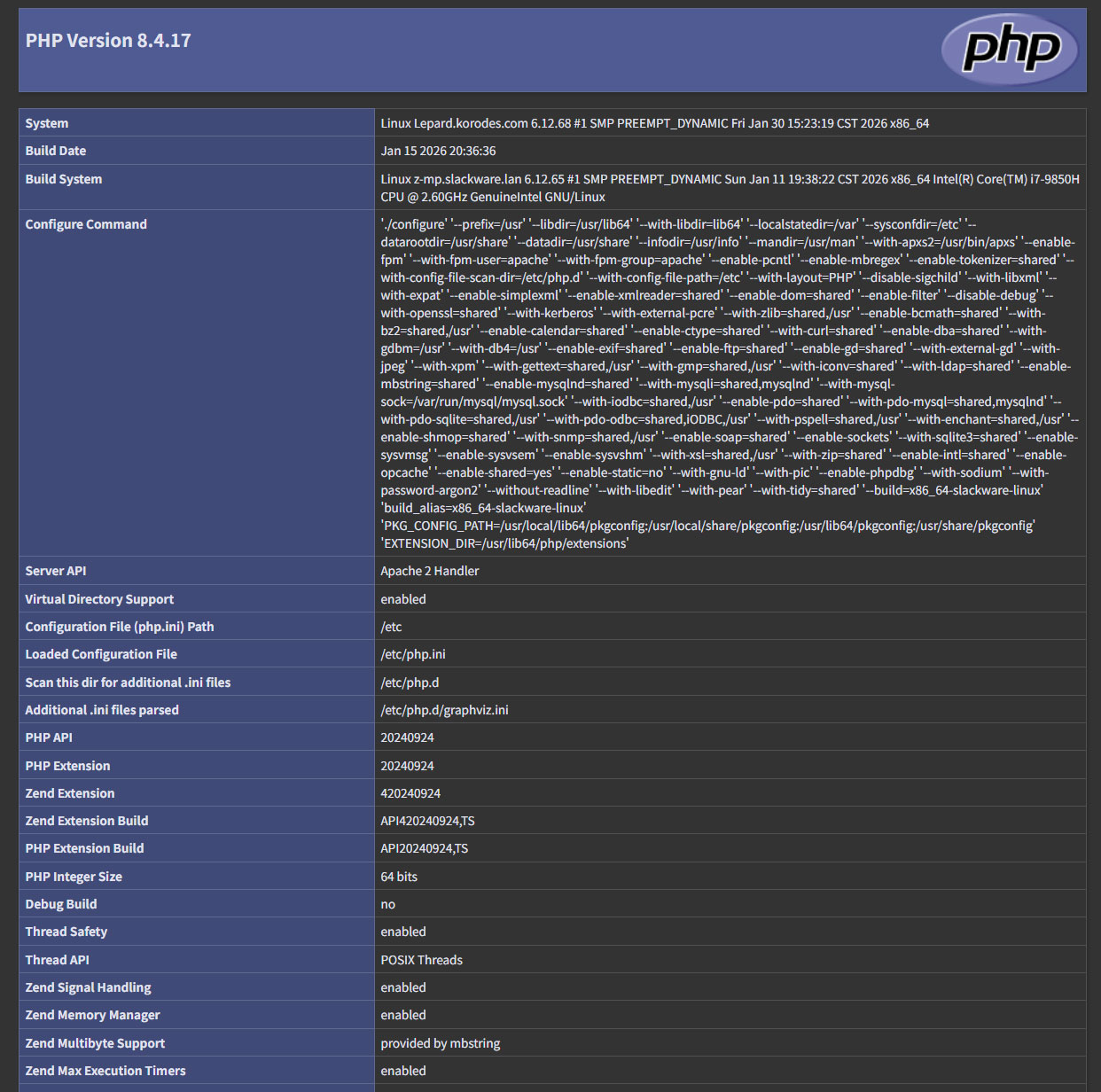 # php -v PHP 8.4.17 (cli) (built: Jan 15 2026 20:36:40) (ZTS) Copyright (c) The PHP Group Zend Engine v4.4.17, Copyright (c) Zend Technologies with Zend OPcache v8.4.17, Copyright (c), by Zend Technologies |