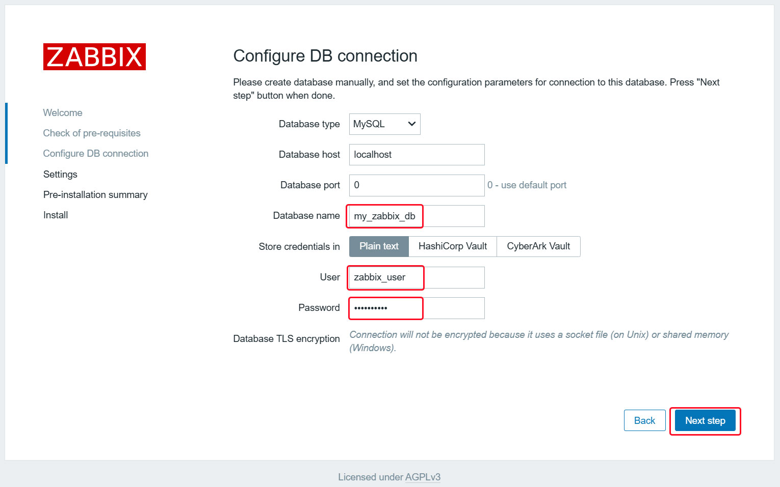 「Database name」「User」「Password」欄には、設定した情報を入力し、[ Next step ]をクリック