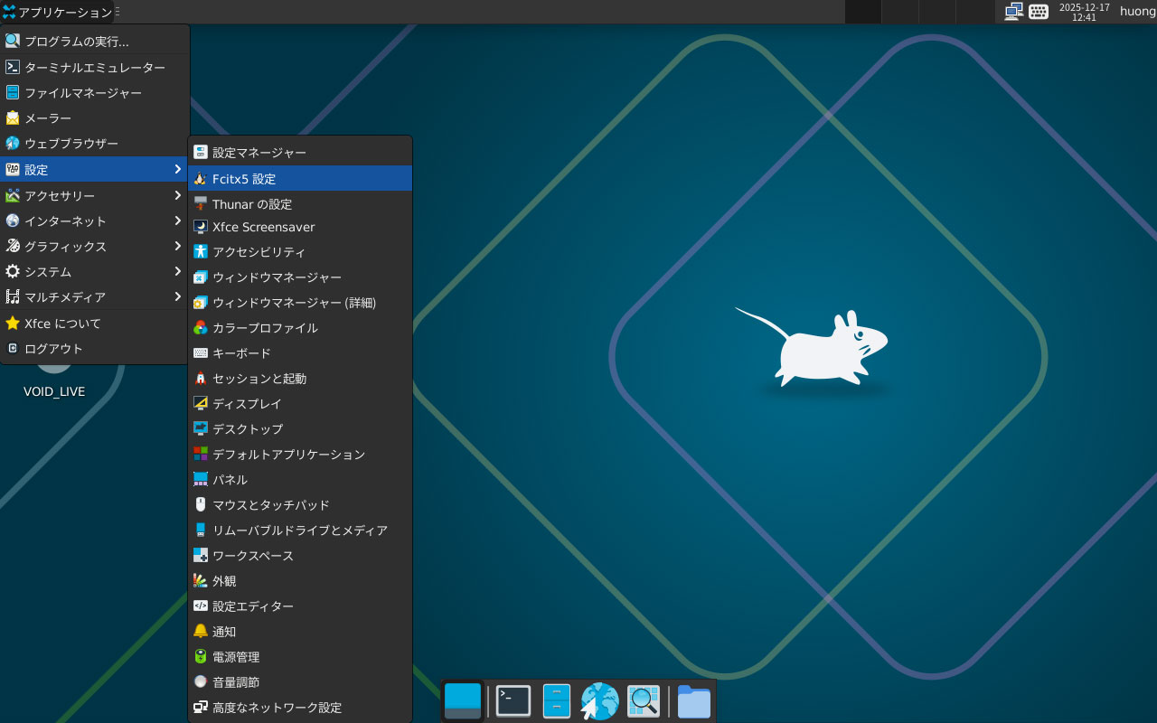# xbps-install xprop fcitx5 fcitx5-mozc fcitx5-configtool # xbps-install fcitx5-gtk fcitx5-gtk+2 fcitx5-gtk+3 fcitx5-gtk4 fcitx5-qt fcitx5-qt5 fcitx5-qt6 |